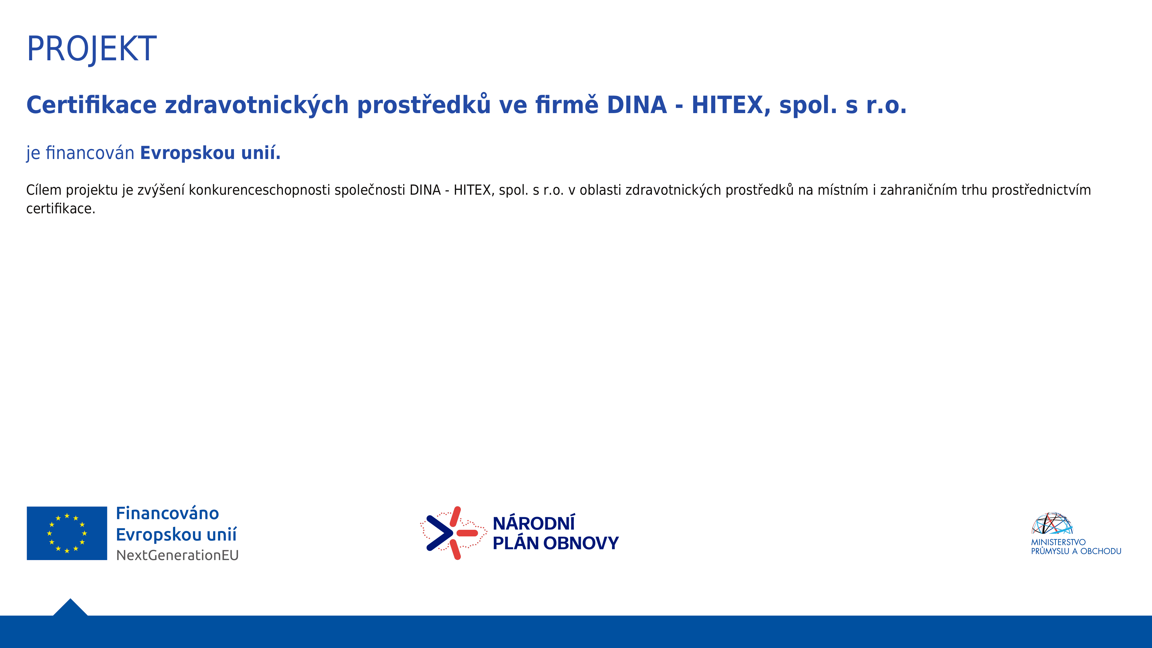 Naše činnost je podporována Evropskou unií. Cílem projektu s názvem „Certifikace zdravotnických prostředků ve firmě DINA – HITEX, spol. s r.o.“ je zvýšení konkurenceschopnosti v oblasti zdravotnických prostředků na místním i zahraničním trhu prostřednictvím získané certifikace. Na uvedený projekt je poskytována finanční podpora z fondů EU prostřednictvím Národního plánu obnovy.